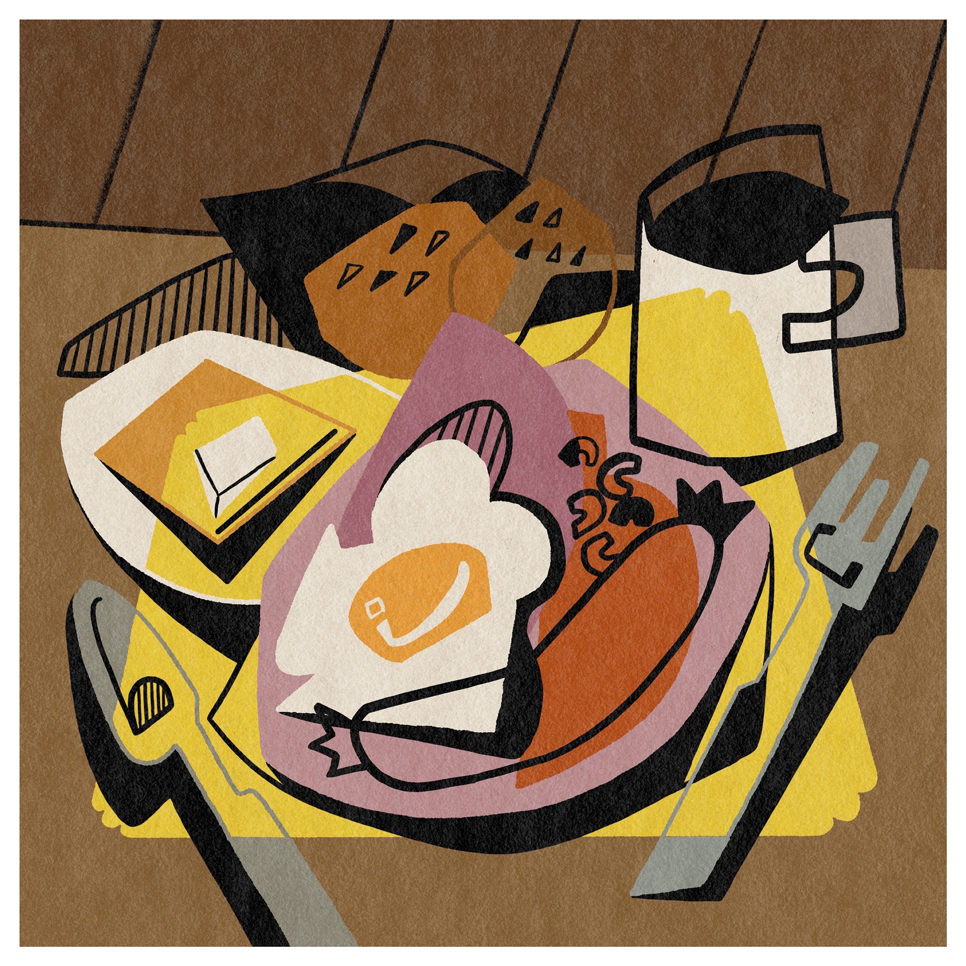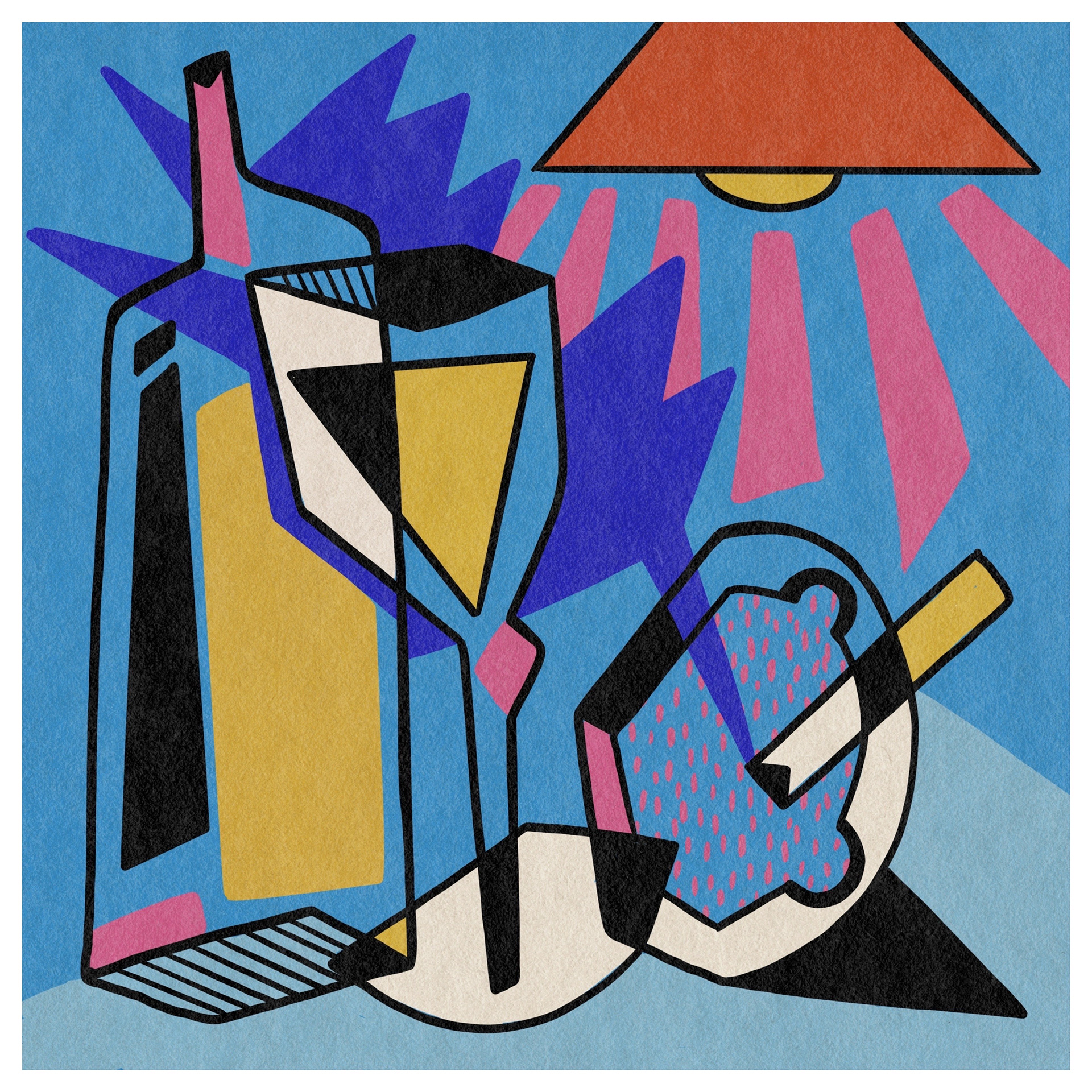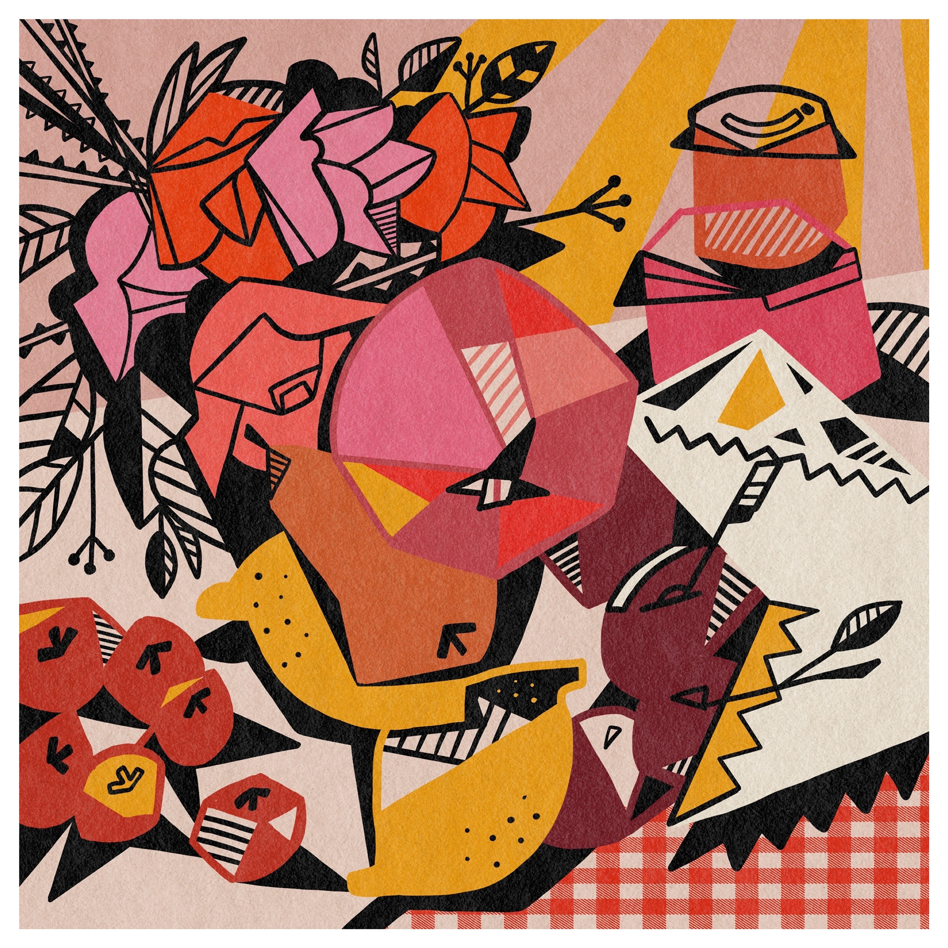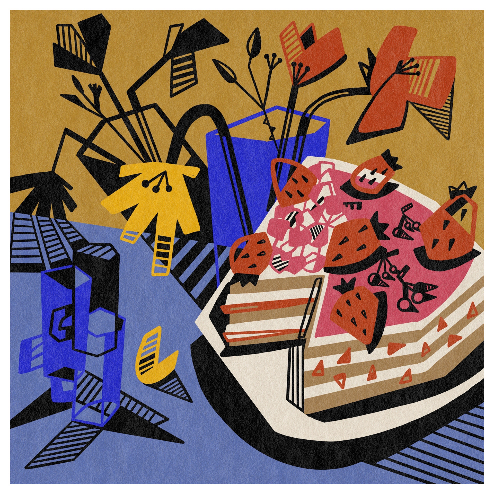 When illustrating food and still life, I take a slightly abstract approach, using bold colours, contrasting thick black lines, and playful light and shadow. With familiar natural forms and everyday objects, I like to leave space for the viewer to connect the pieces—evoking personal memories and interpretations.