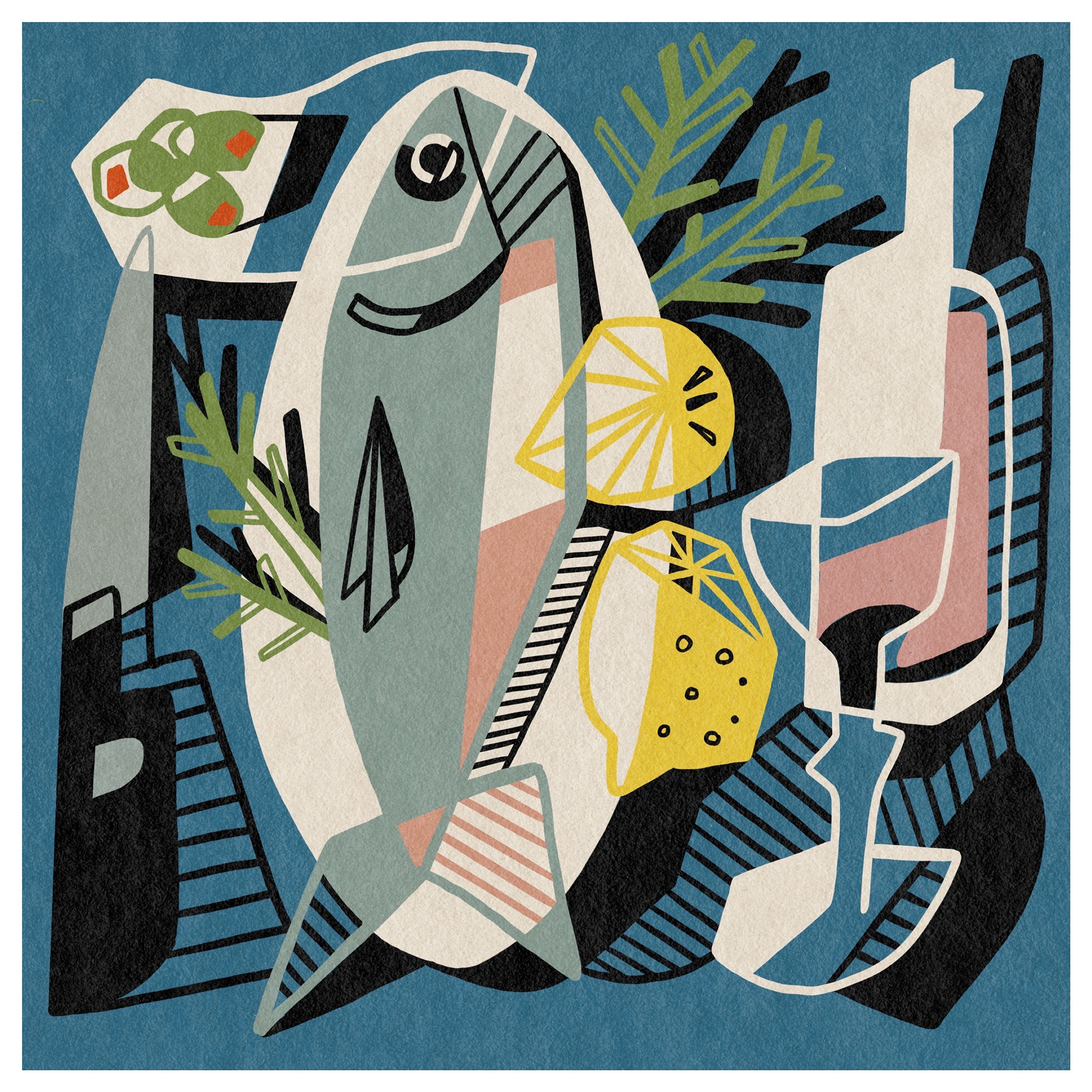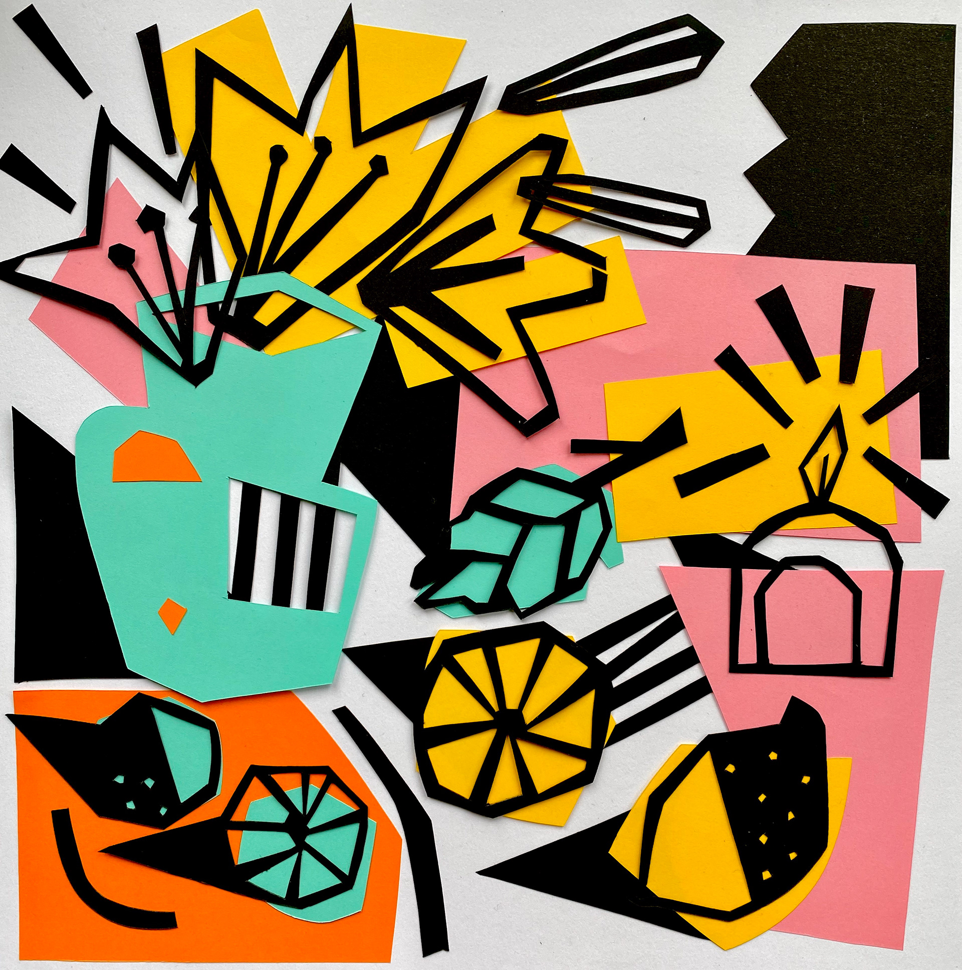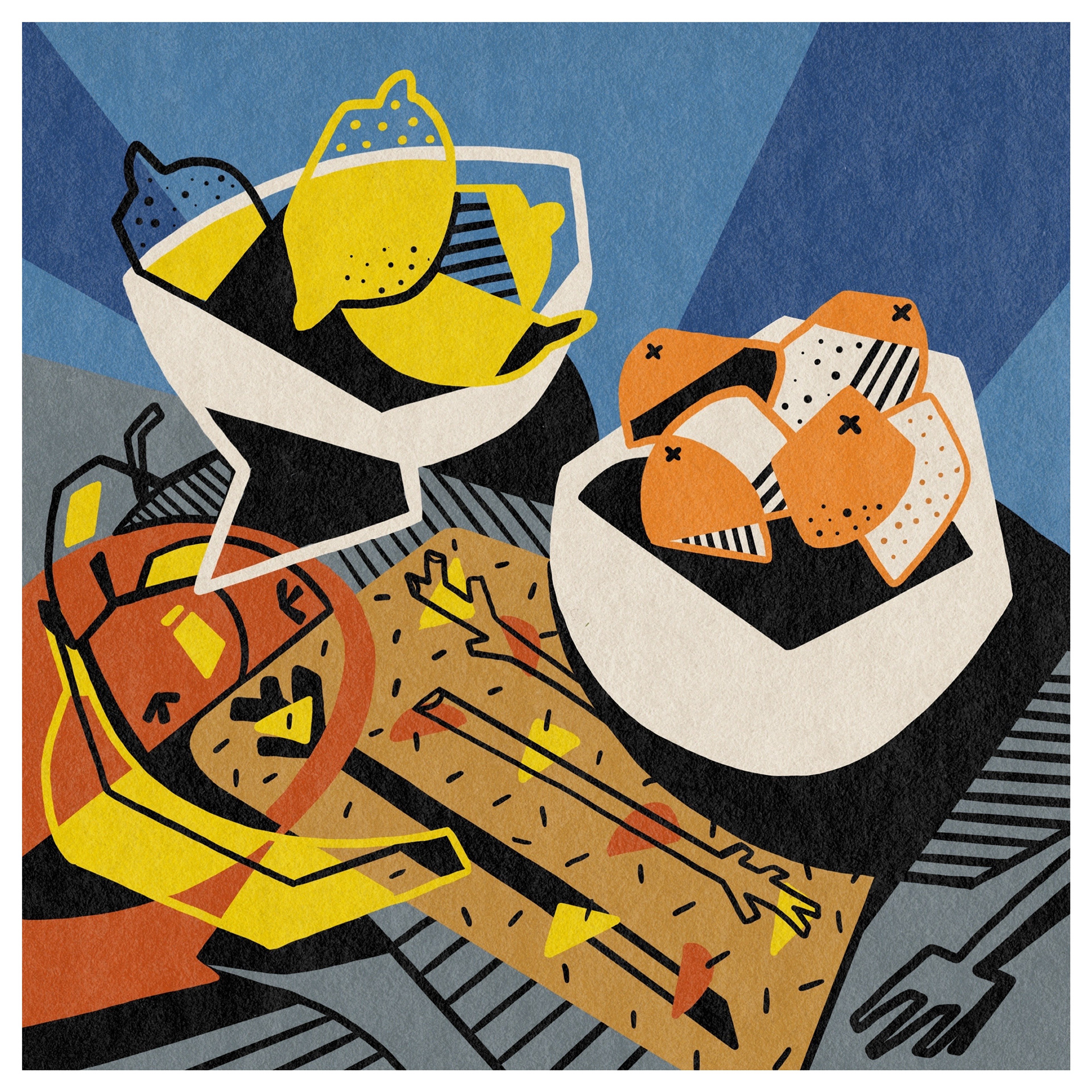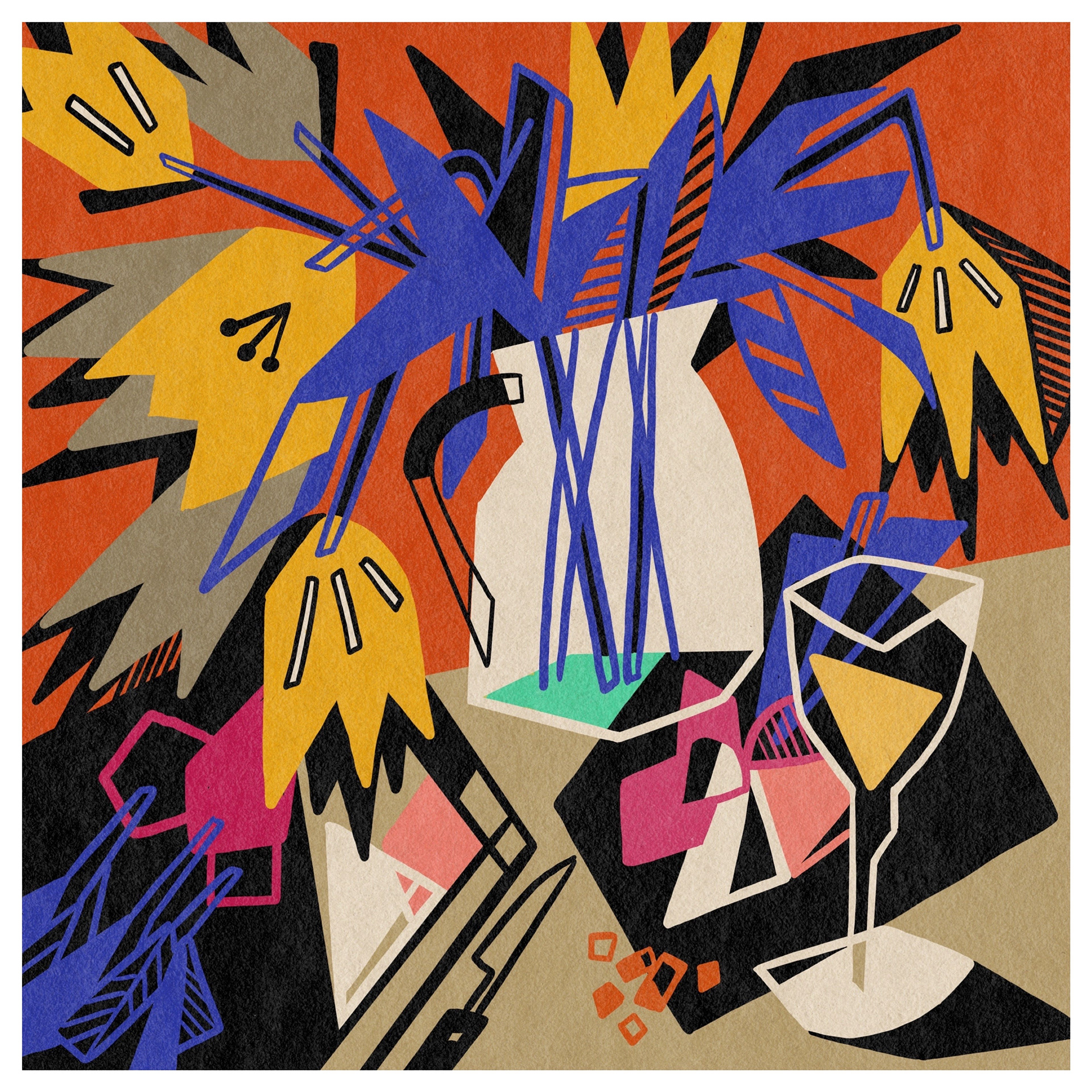 When illustrating food and still life, I take a slightly abstract approach, using bold colours, contrasting thick black lines, and playful light and shadow. With familiar natural forms and everyday objects, I like to leave space for the viewer to connect the pieces—evoking personal memories and interpretations.