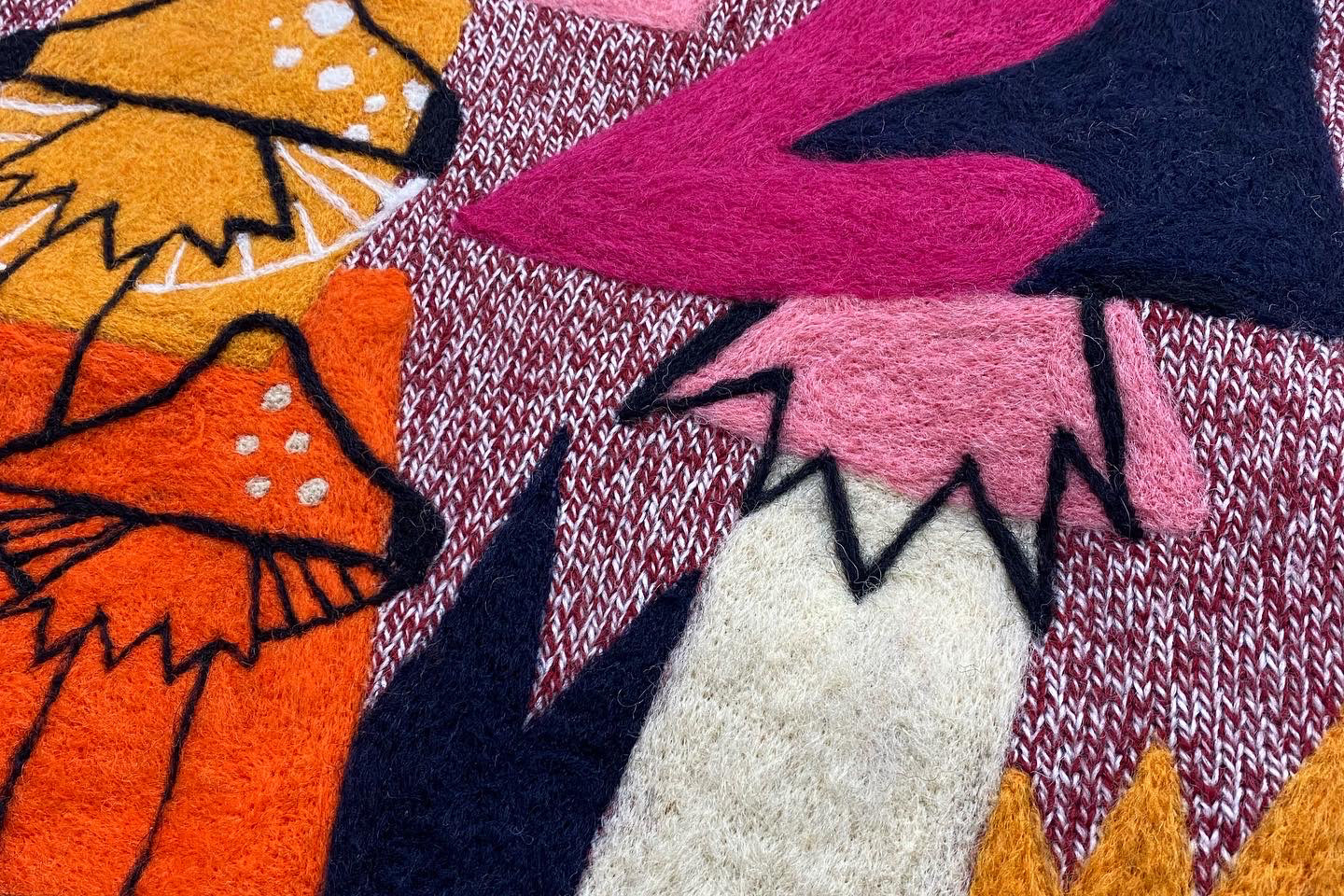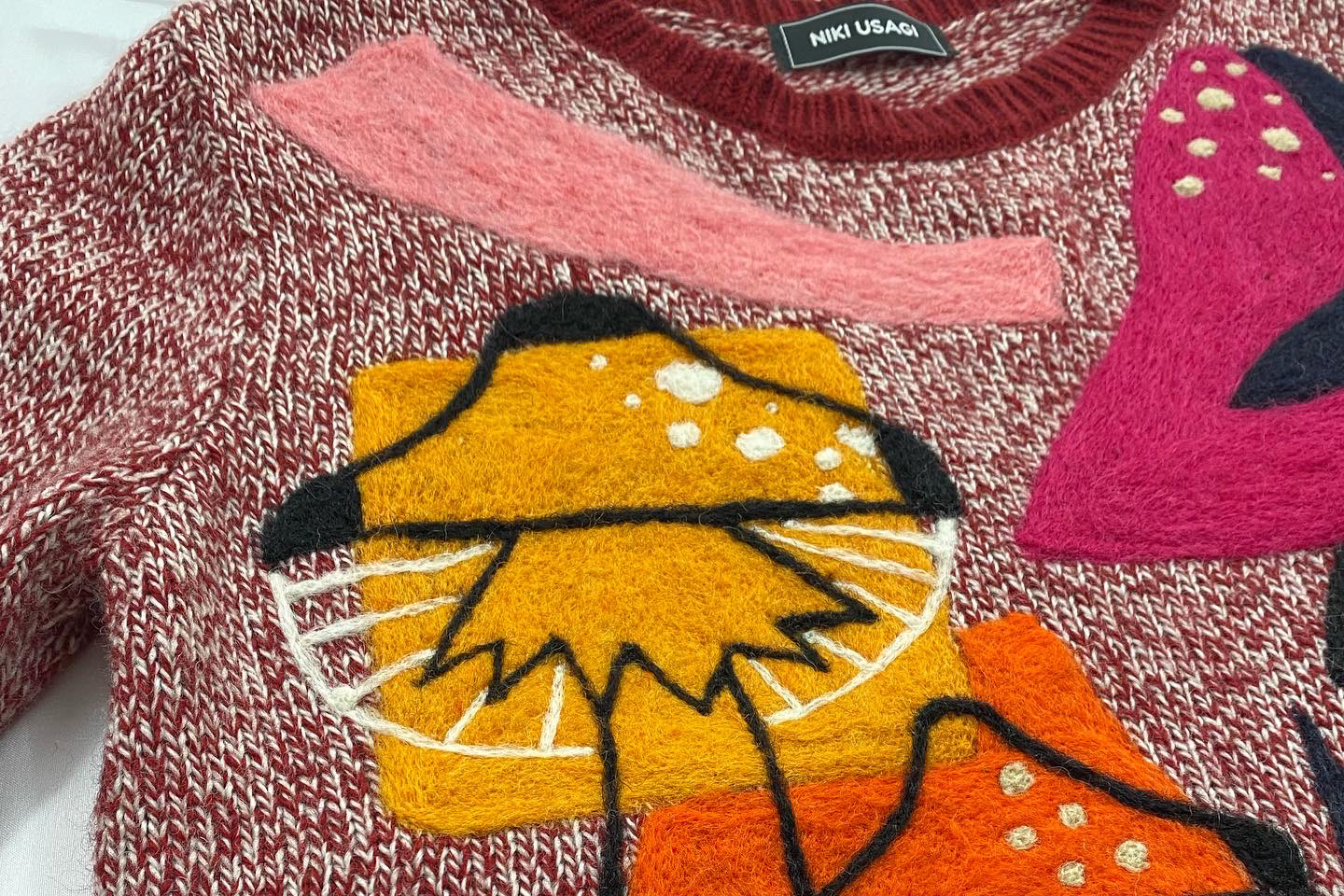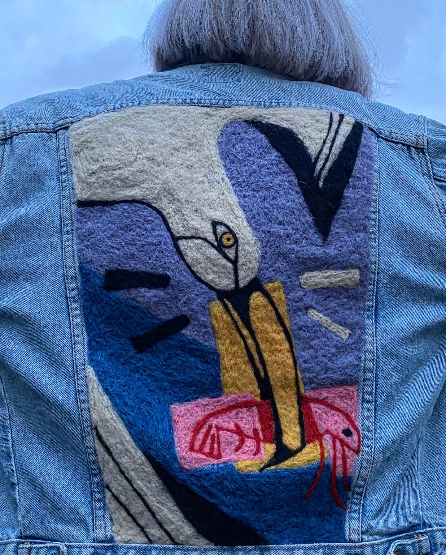 I'm passionate about slow fashion and sustainable design, incorporating recycled materials into my creative practice. I craft bespoke crochet pieces and upcycle thrifted garments—such as workwear, knitwear, and denim jackets—by painting or felting my illustrations onto them. I also experiment with the punch needle technique, creating unique rugs and tapestries that blend texture and storytelling.